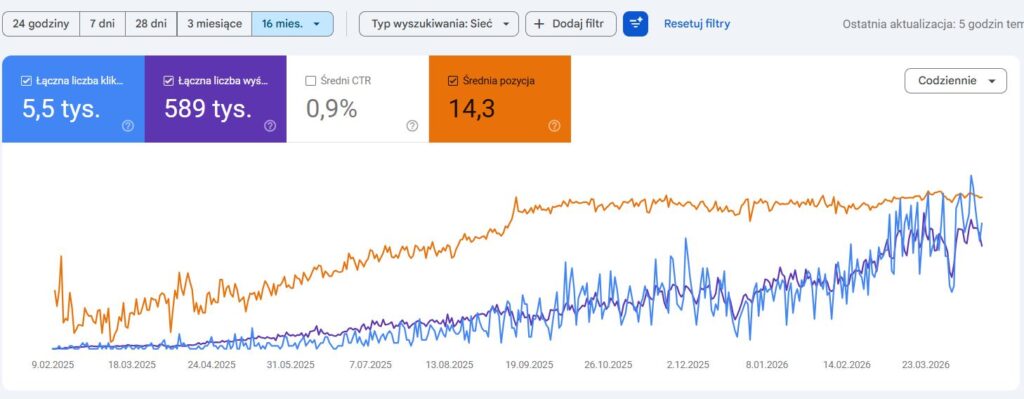 W lutym 2025 strona generowała niecałe 1 000 wyświetleń w Google. W marcu 2026 było ich już ponad 111 tysięcy. Wzrost o blisko 11 700% to nie jest literówka. Strona, która wcześniej była praktycznie niewidoczna, zaczęła pojawiać się na dziesiątki tysięcy zapytań dziennie.