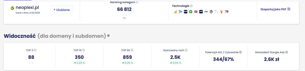 Senuto estymuje miesięczny ruch z organika na poziomie 2,5 tysiąca wizyt. Dla niszowej branży producenta wyrobów z plexi to wynik, który realnie przekłada się na zapytania ofertowe i zamówienia.