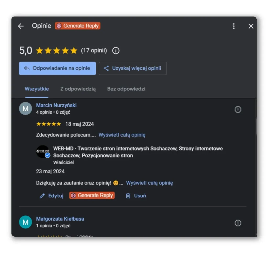 Zarządzanie opiniami to obecnie jeden z najsilniejszych sygnałów rankingowych w wyszukiwaniu lokalnym. Systematyczne pozyskiwanie nowych treści od użytkowników i odpowiadanie na każdą opinie klientów (szczególnie te krytyczne) pokazuje Google, że Twoja firma dba o User Experience. Warto pamiętać, że recenzje zawierające naturalne lokalne słowa kluczowe wpisane przez użytkowników dodatkowo wzmacniają Twój autorytet tematyczny, czyniąc profil bardziej odpornym na zmiany algorytmów.